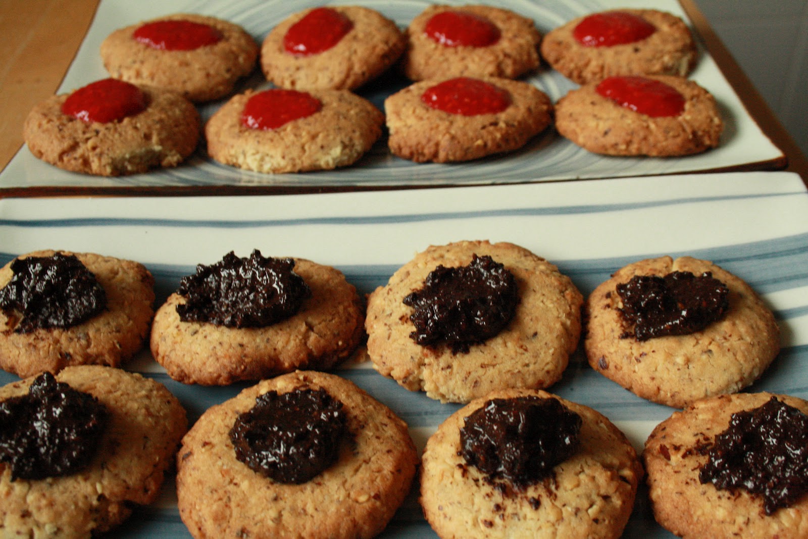 Estas são simplesmente bolachas de avelã, muito fáceis e rápidas de fazer - demorei uns quarenta e cinco minutos no total, mas se não tivesse tido a participação da minha ajudante favorita teria sido um pouco mais rápido - e com um pequeno toque de geleia de framboesa (isto na receita original). Não usei geleia, usei molho de framboesa porque estive a fazer também uma panna cotta para o jantar. Mas isto foi só em metade da fornada... é que depois de ver as da Sofia, que usou chocolate, passei o dia a pensar em como ficariam deliciosas se esse chocolate levasse também um pouco de avelãs e não pude resistir e usá-lo na outra metade da fornada.